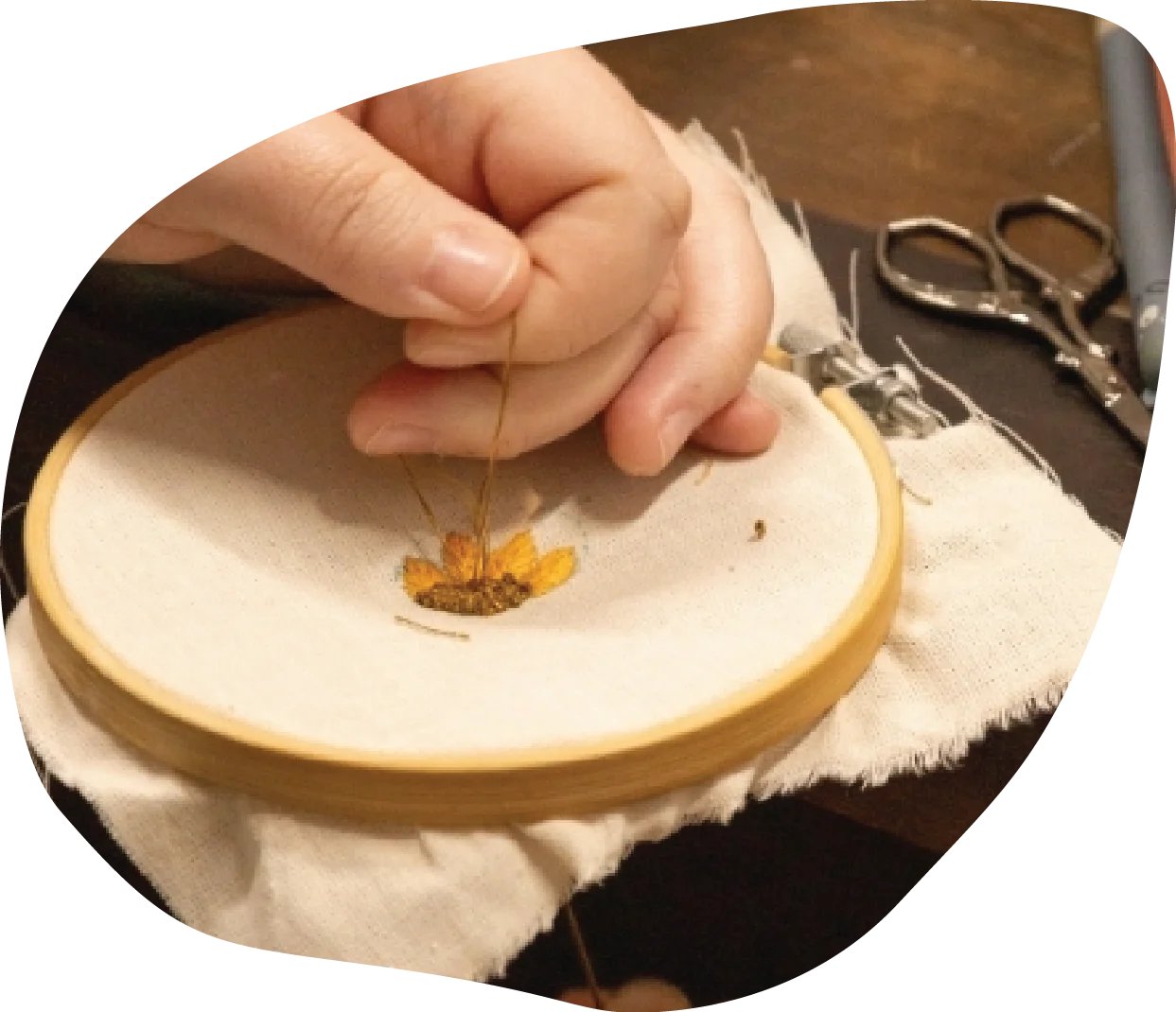 Por ser uma técnica manual, as aulas de bordado livre são totalmente práticas. Em um ambiente acolhedor, proporcionado pelo encontro presencial, cada pessoa é incentivada a explorar seu lado mais criativo, elaborando peças autorais únicas e artesanais, feitas à mão, com linhas, agulhas e tecido.