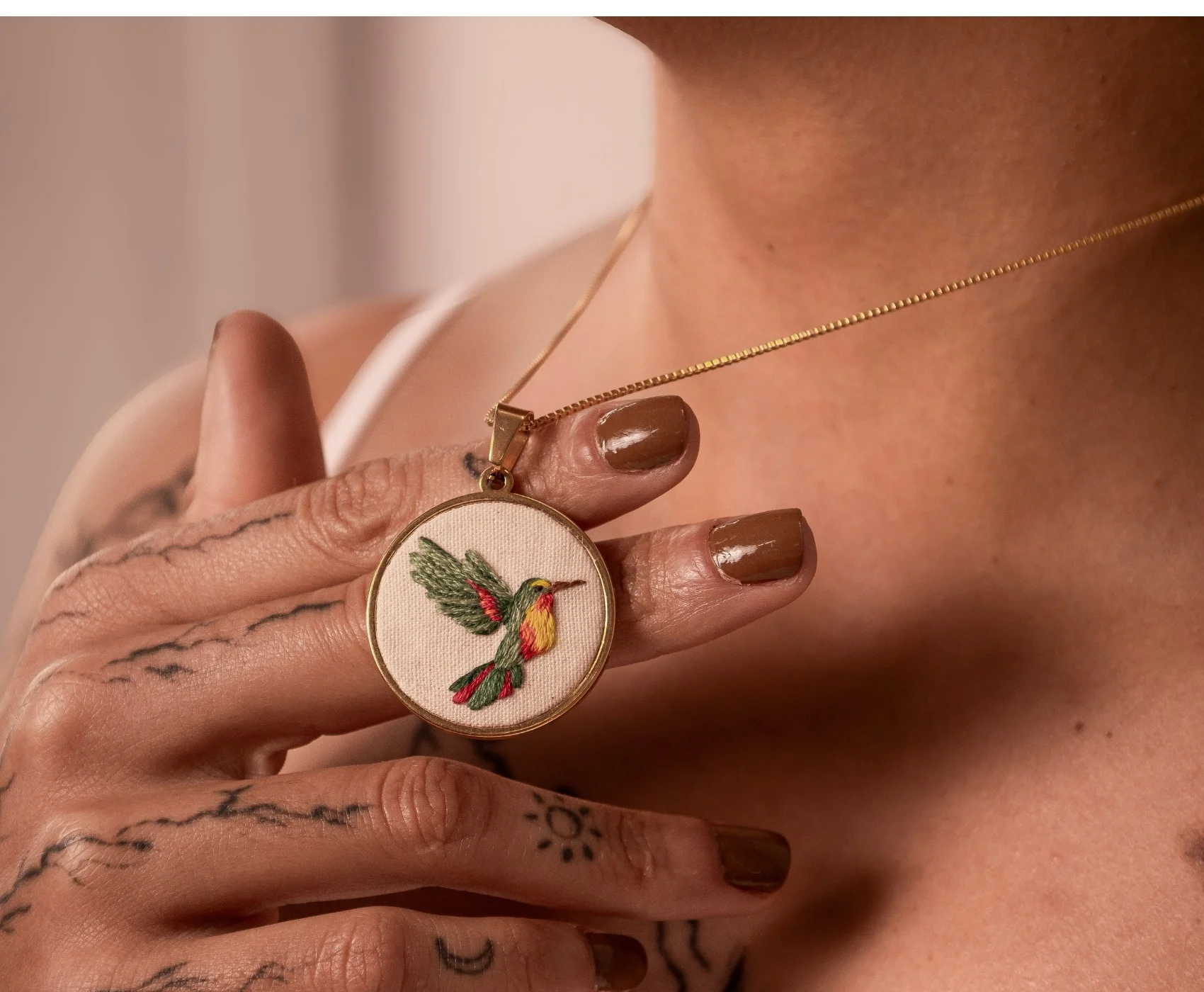 Os pingentes bordados à mão trazem delicadeza e riqueza de detalhes que impressionam pelo tamanho da peça. Com opções que variam entre 1,3cm e 3cm de diâmetro, os pingentes bordados são exclusivos, pois é impossível reproduzir cópias idênticas quando se trata de uma peça artesanal. Pingente em aço inoxidável bordado à mão, com corrente de 45cm banhada a ouro 18k.