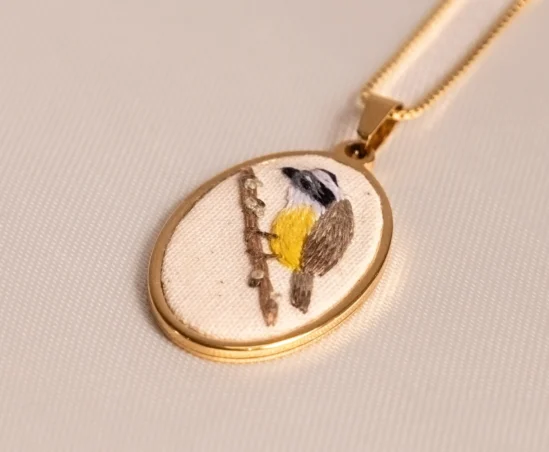 Os pingentes bordados à mão trazem delicadeza e riqueza de detalhes que impressionam pelo tamanho da peça. Com opções que variam entre 1,3cm e 3cm de diâmetro, os pingentes bordados são exclusivos, pois é impossível reproduzir cópias idênticas quando se trata de uma peça artesanal.